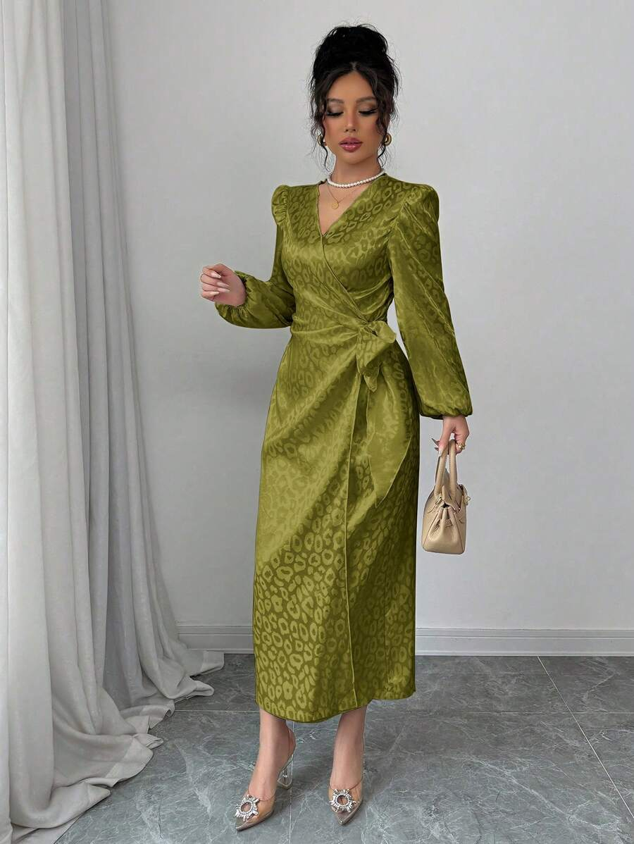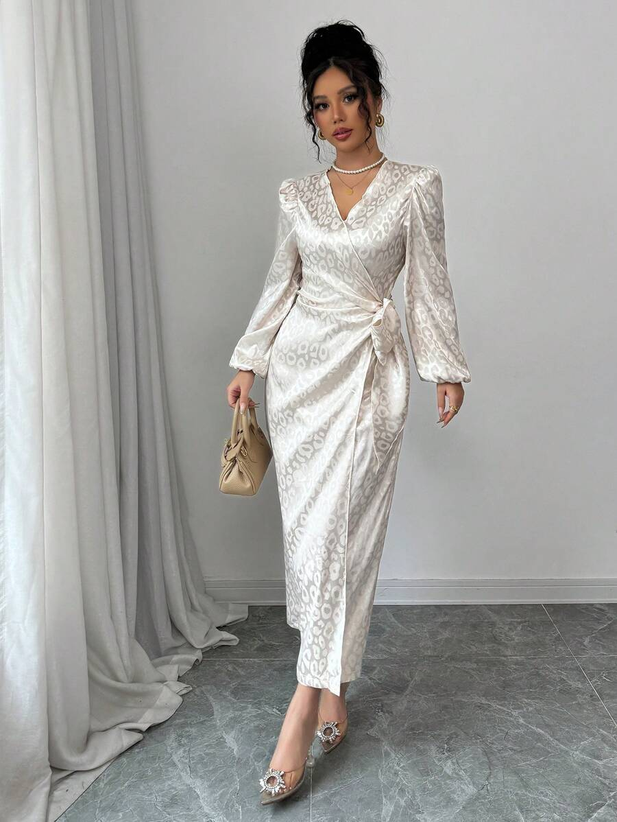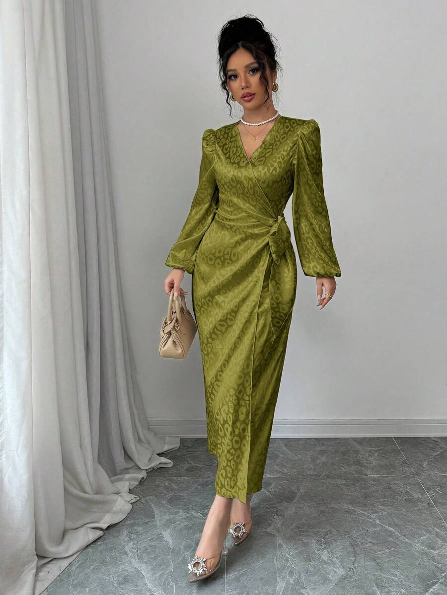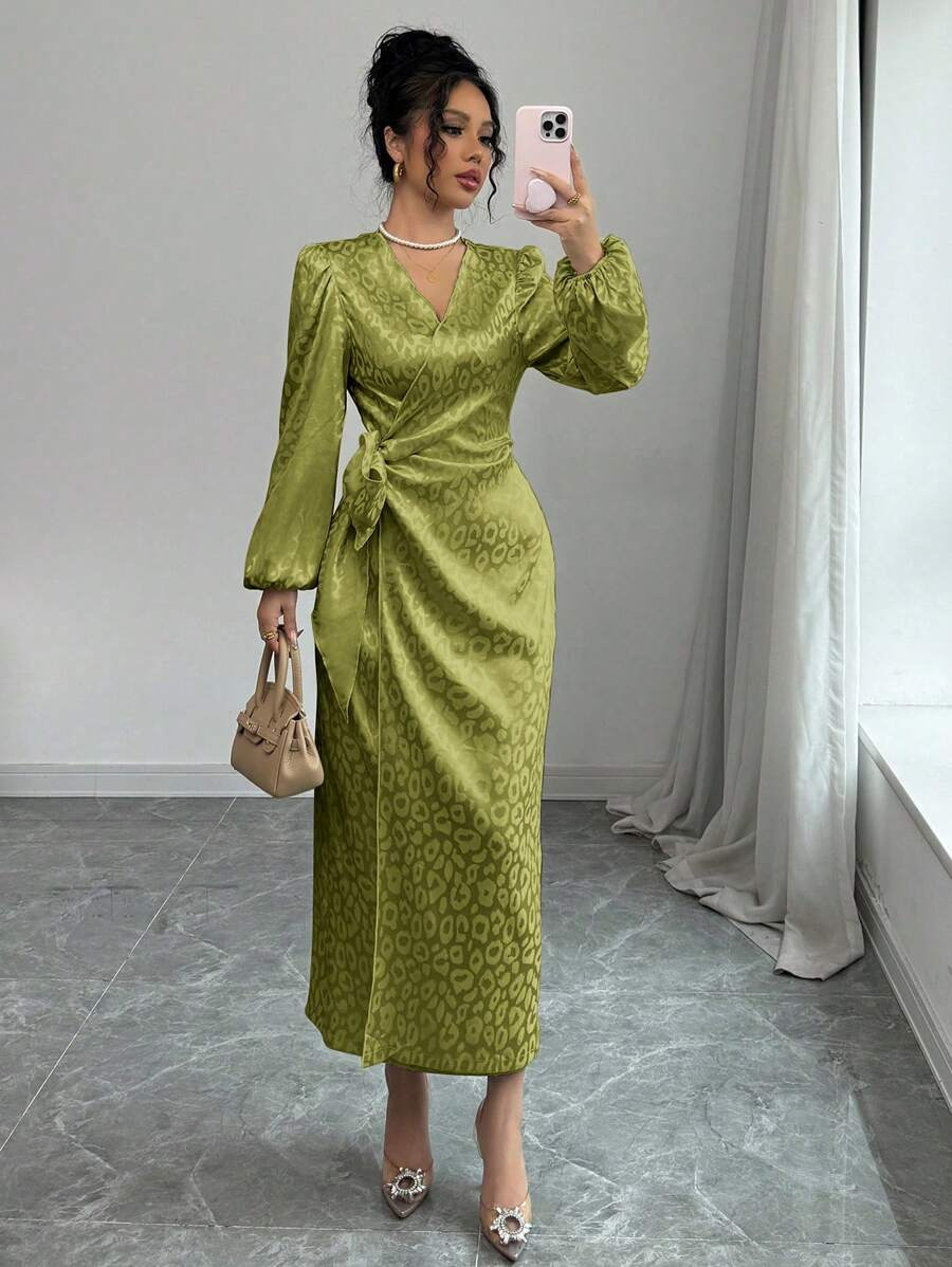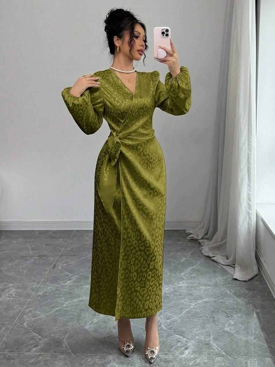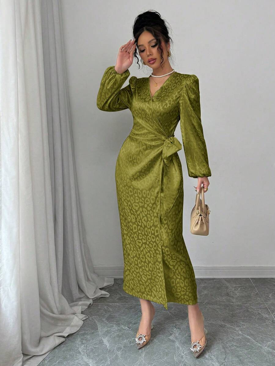 Rafferiza فستان نسائي ضيق الجسم ذو كشكشة في الأكمام ذو فتحة في الرقبة، بطبعة نمر
