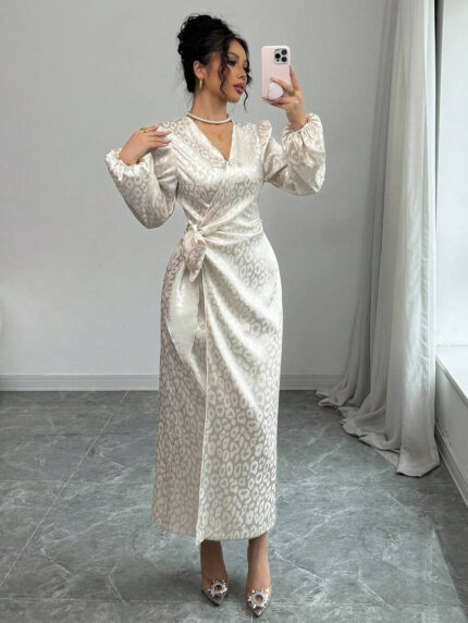 Rafferiza فستان نسائي ضيق الجسم ذو كشكشة في الأكمام ذو فتحة في الرقبة، بطبعة نمر