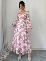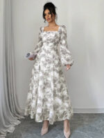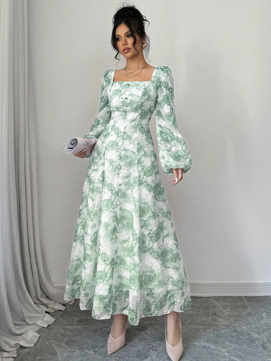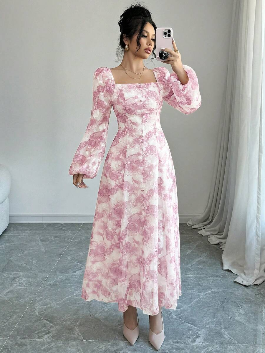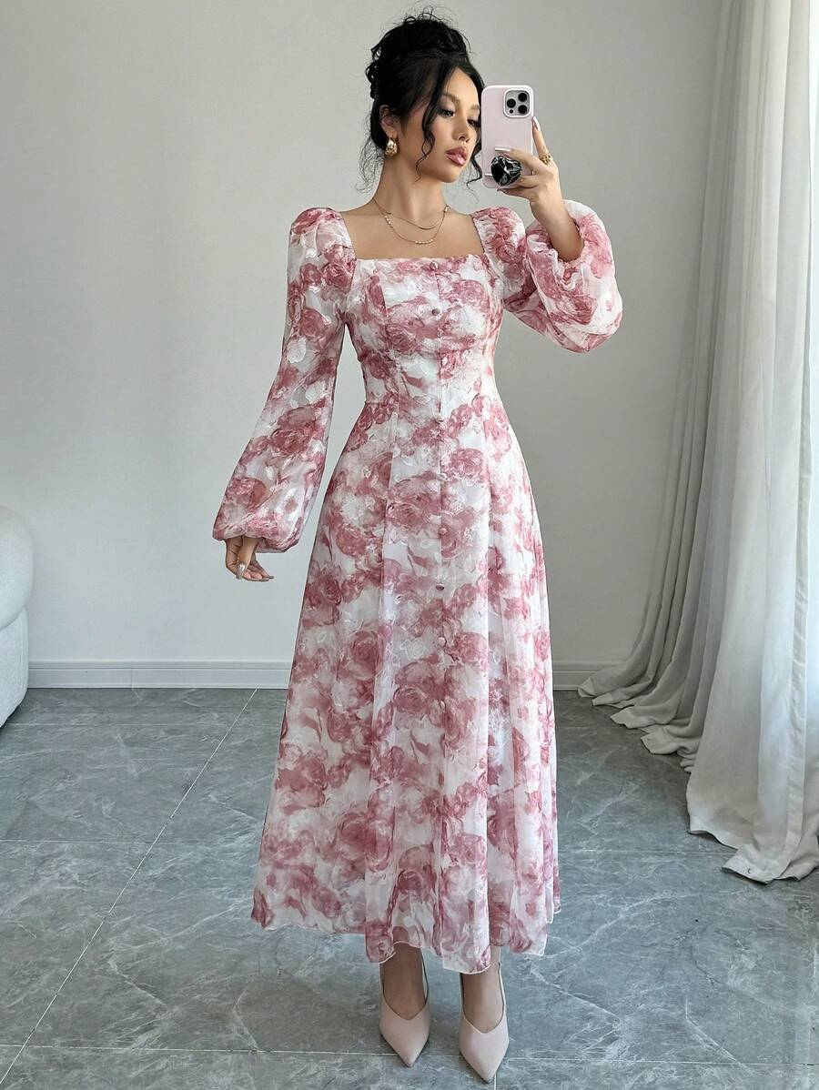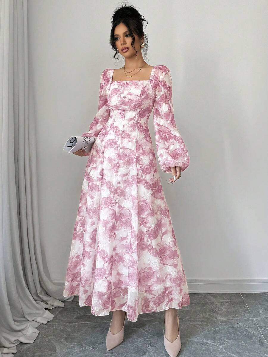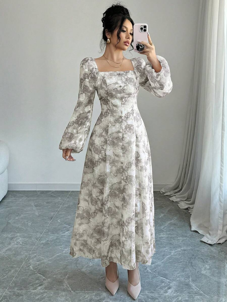 فستان بأكمام فانوس بطبعات زهرية