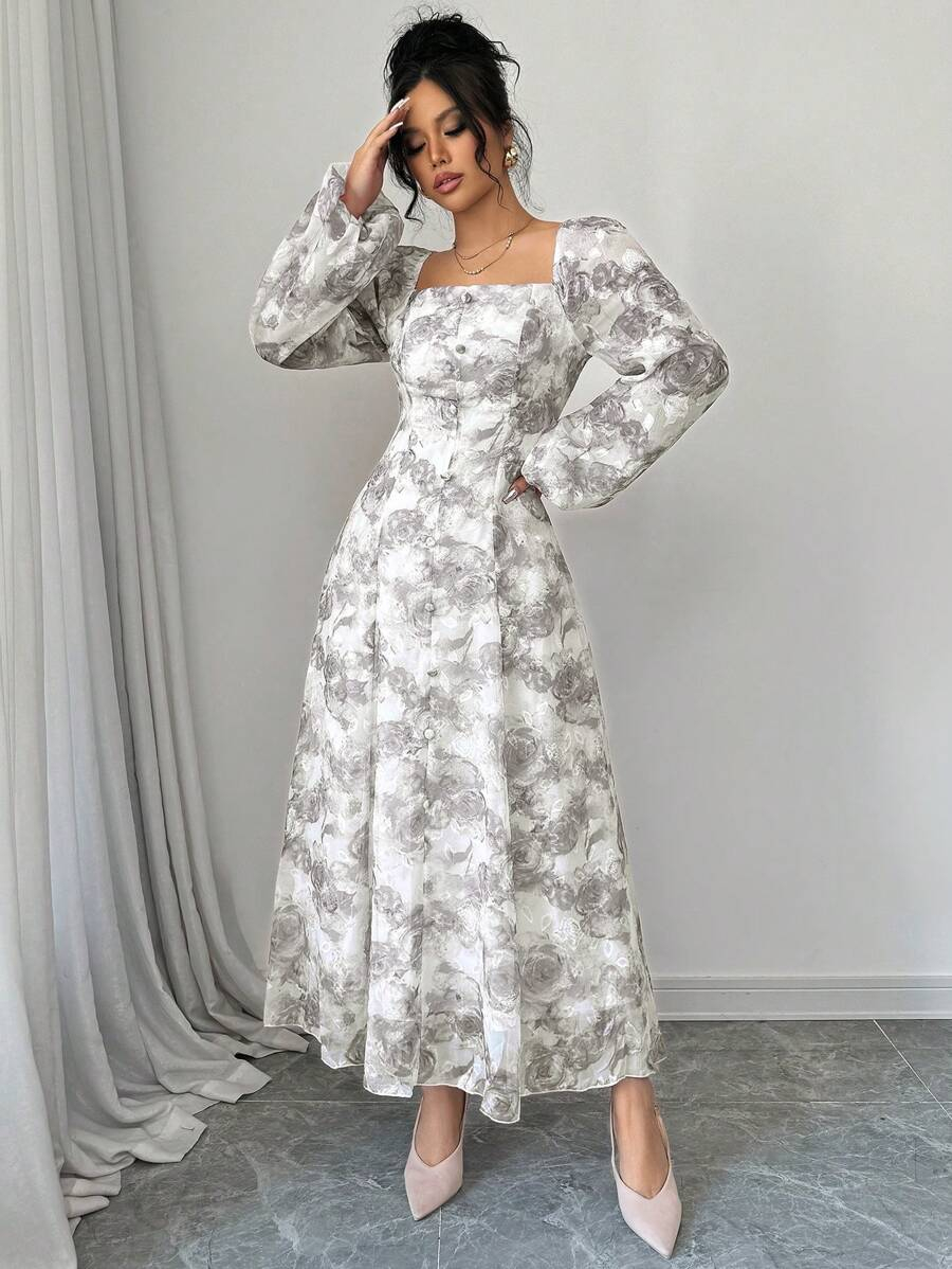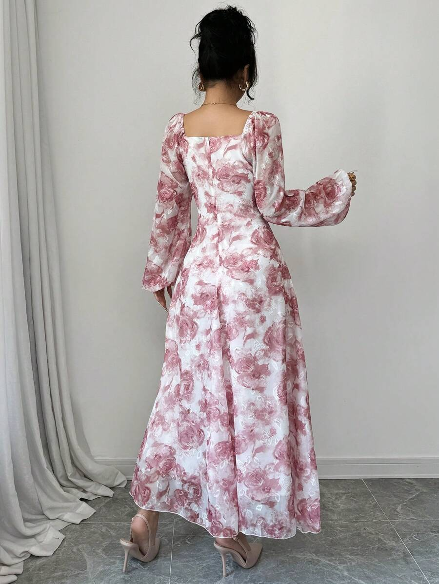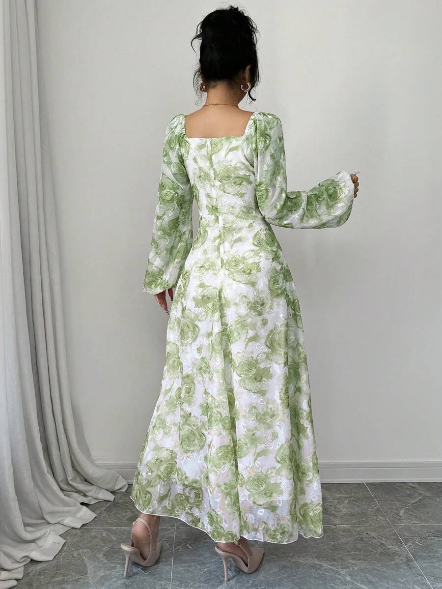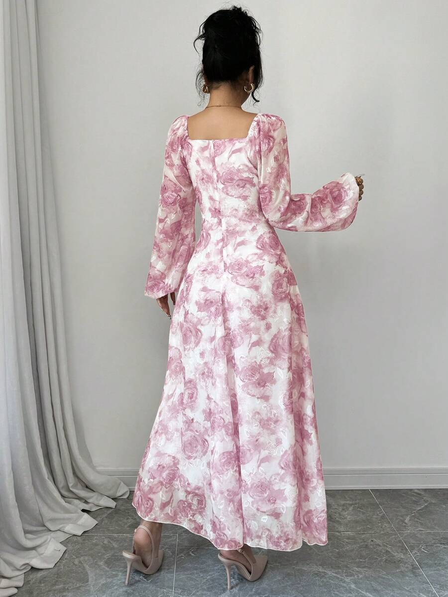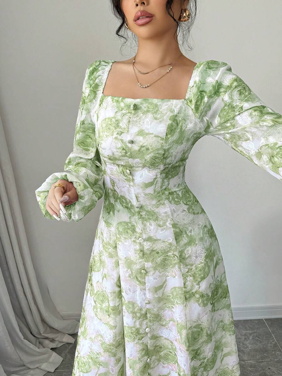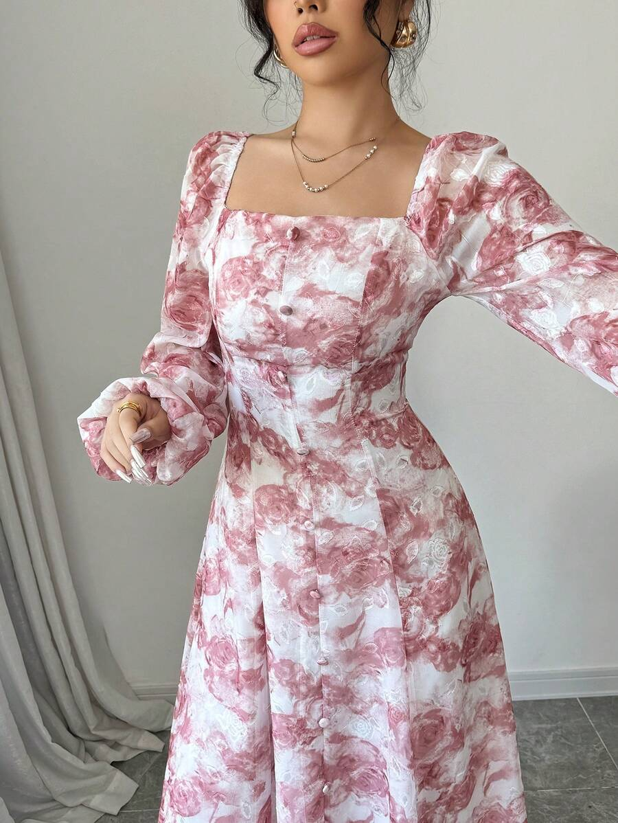 فستان بأكمام فانوس بطبعات زهرية