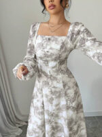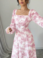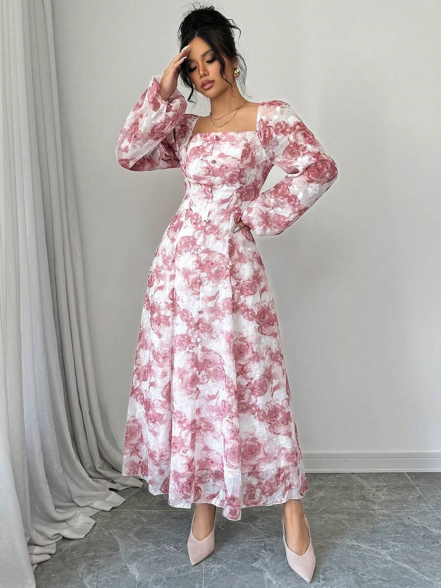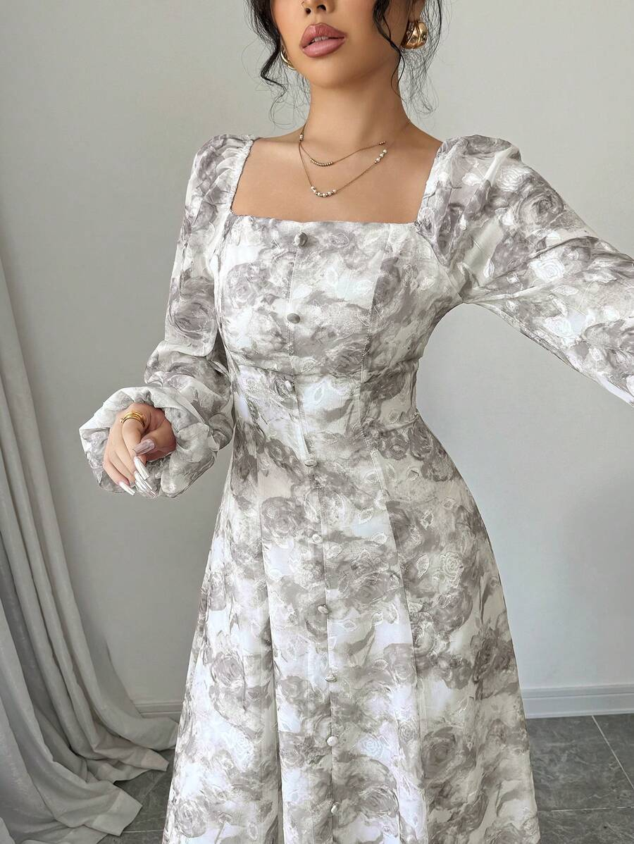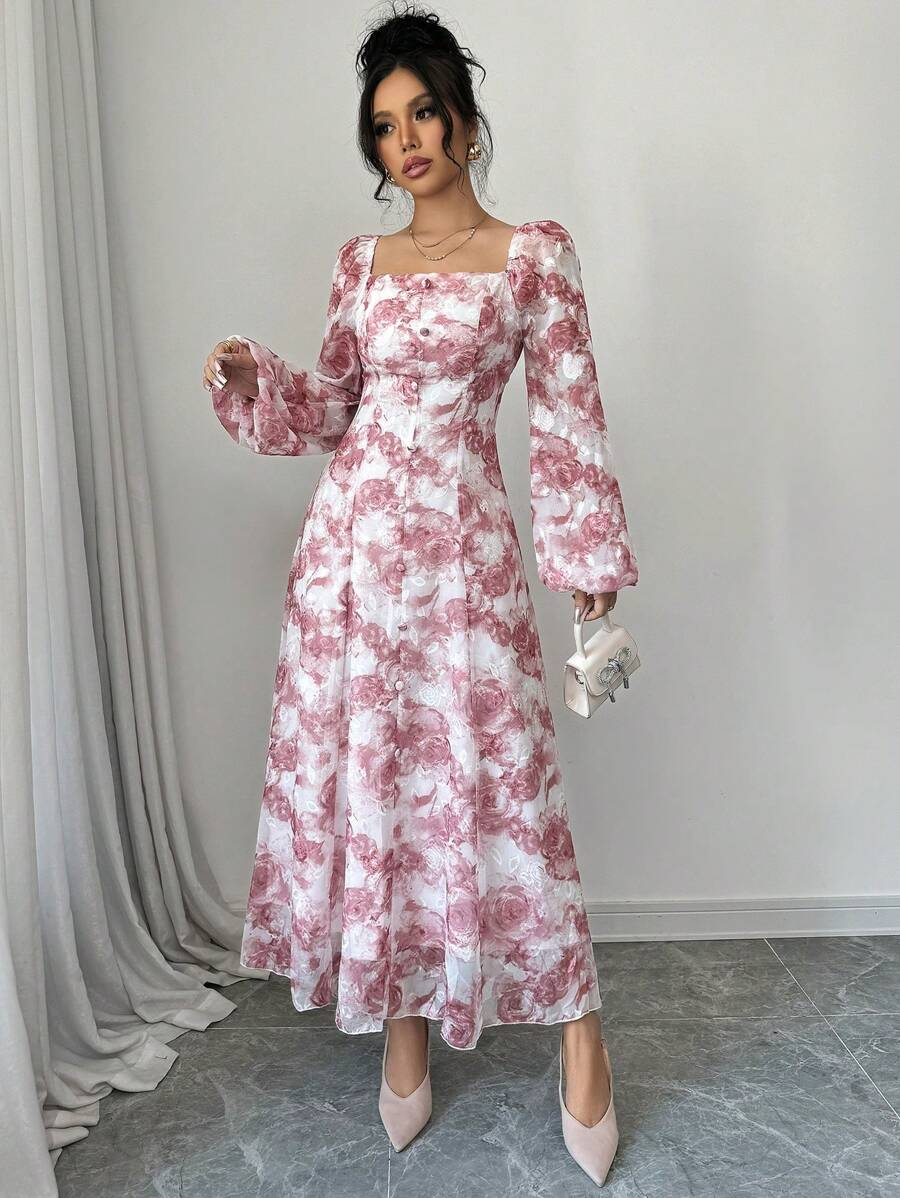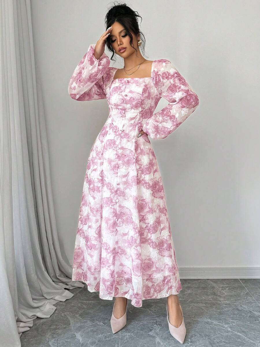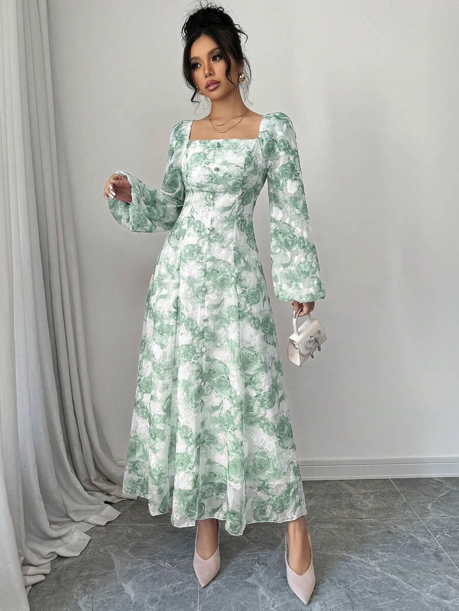 فستان بأكمام فانوس بطبعات زهرية