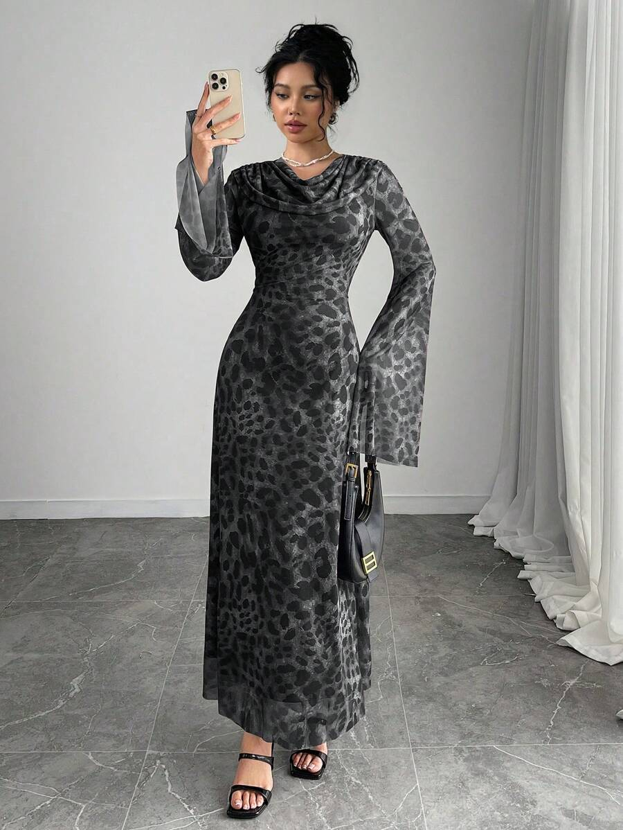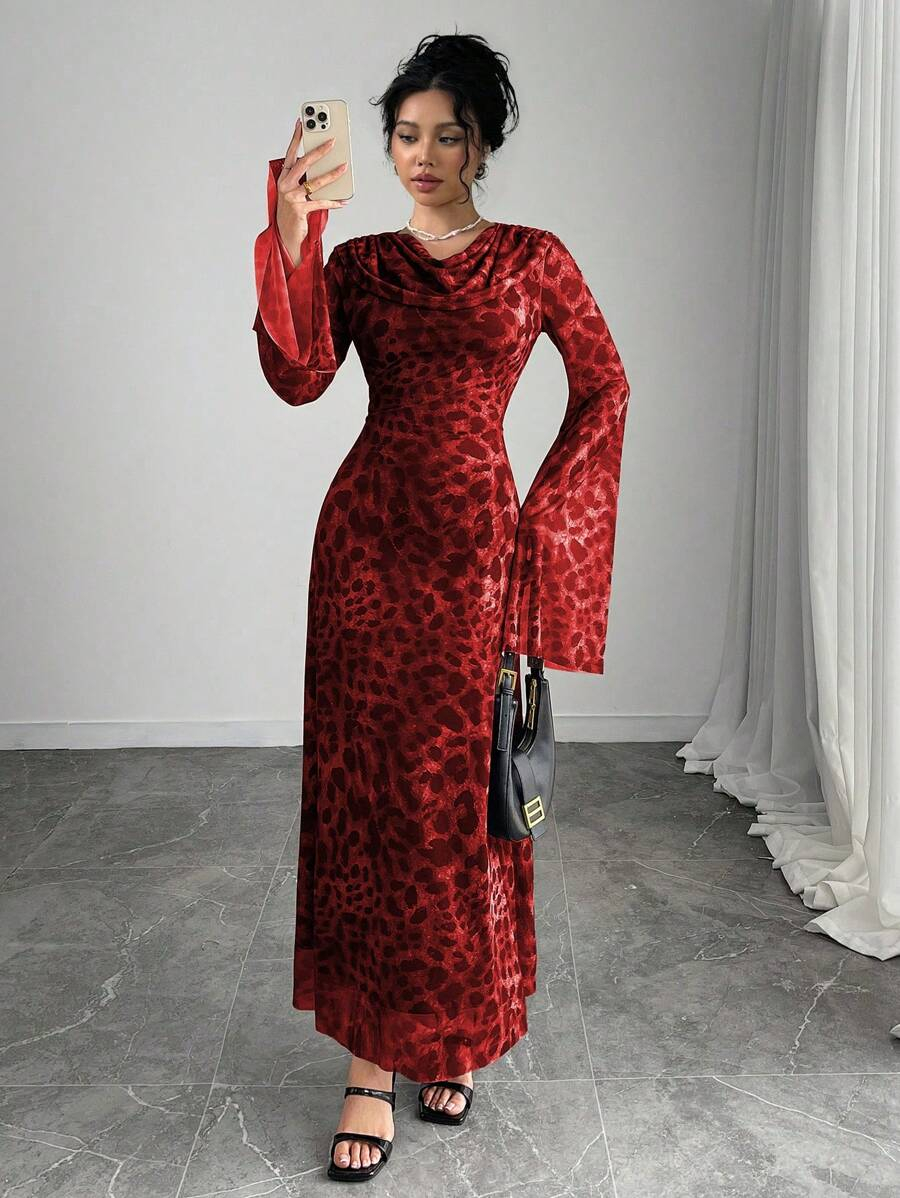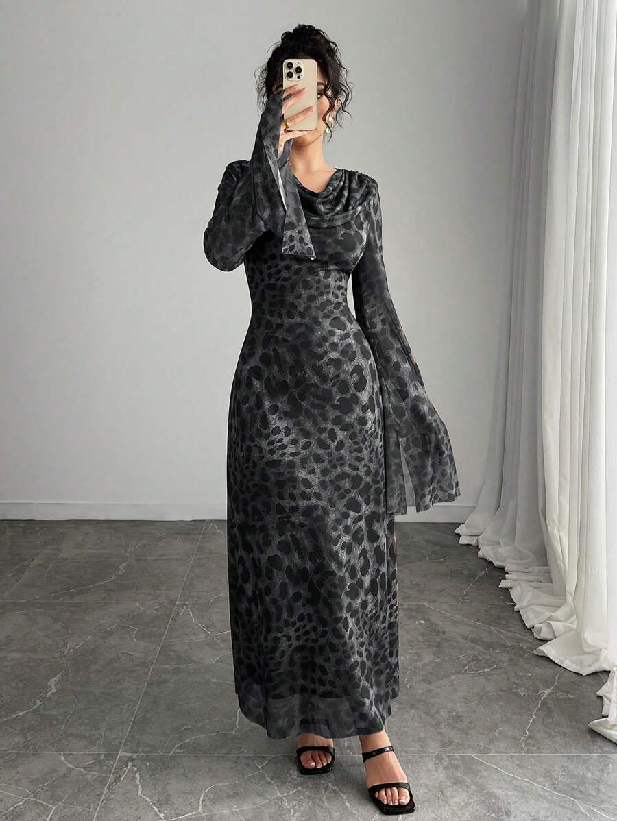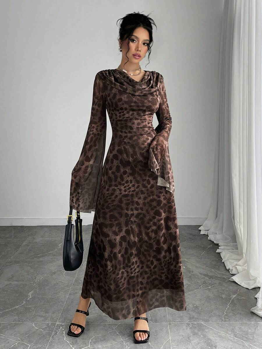 Rafferiza فستان نسائي ضيق الجسم ذو كشكشة في الأكمام ذو فتحة في الرقبة، بطبعة نمر