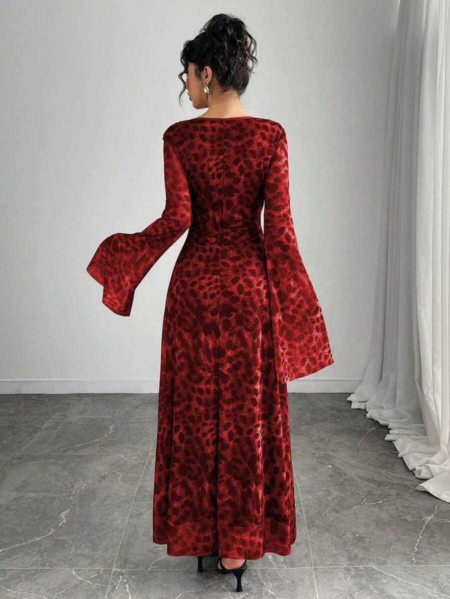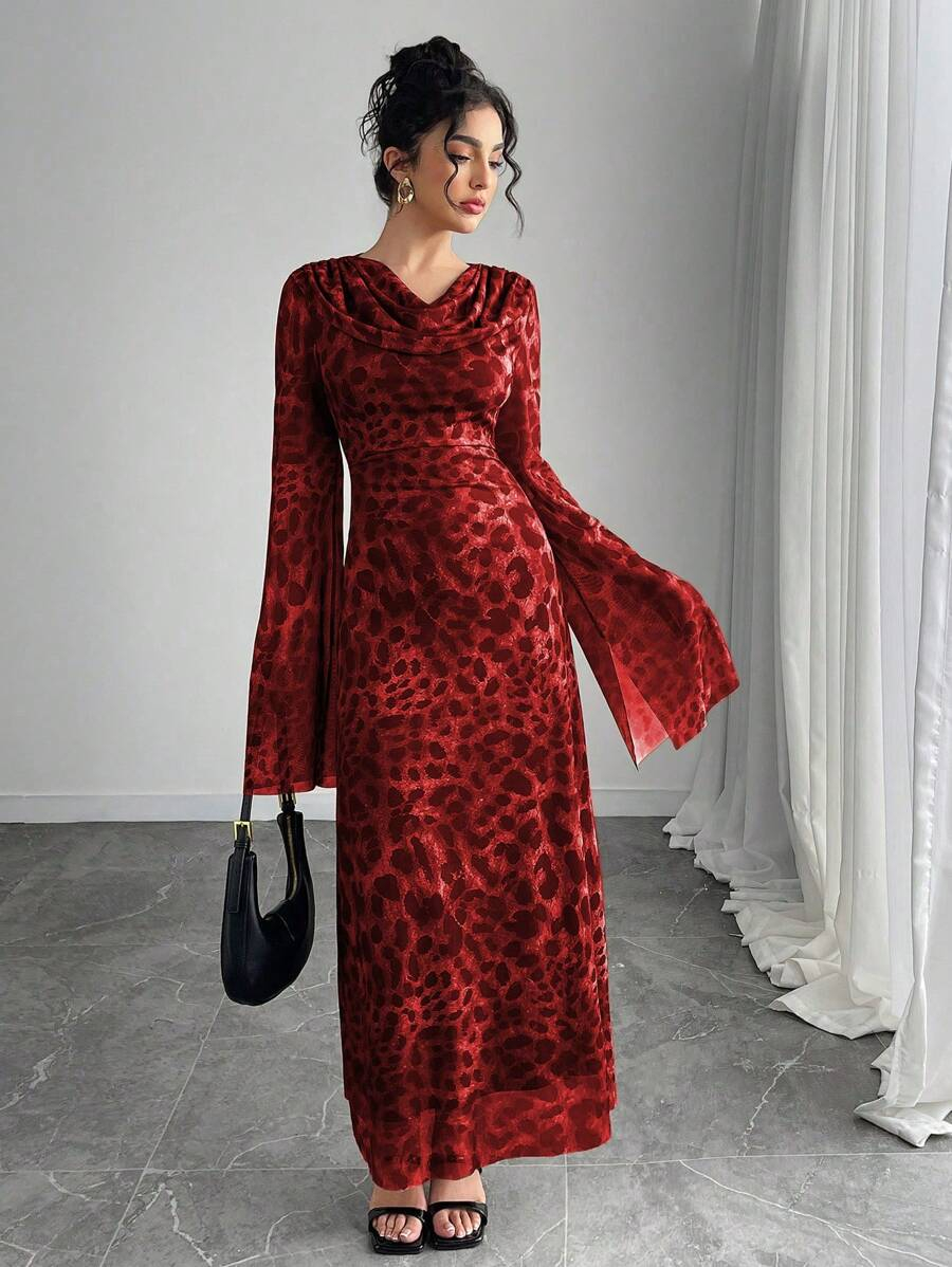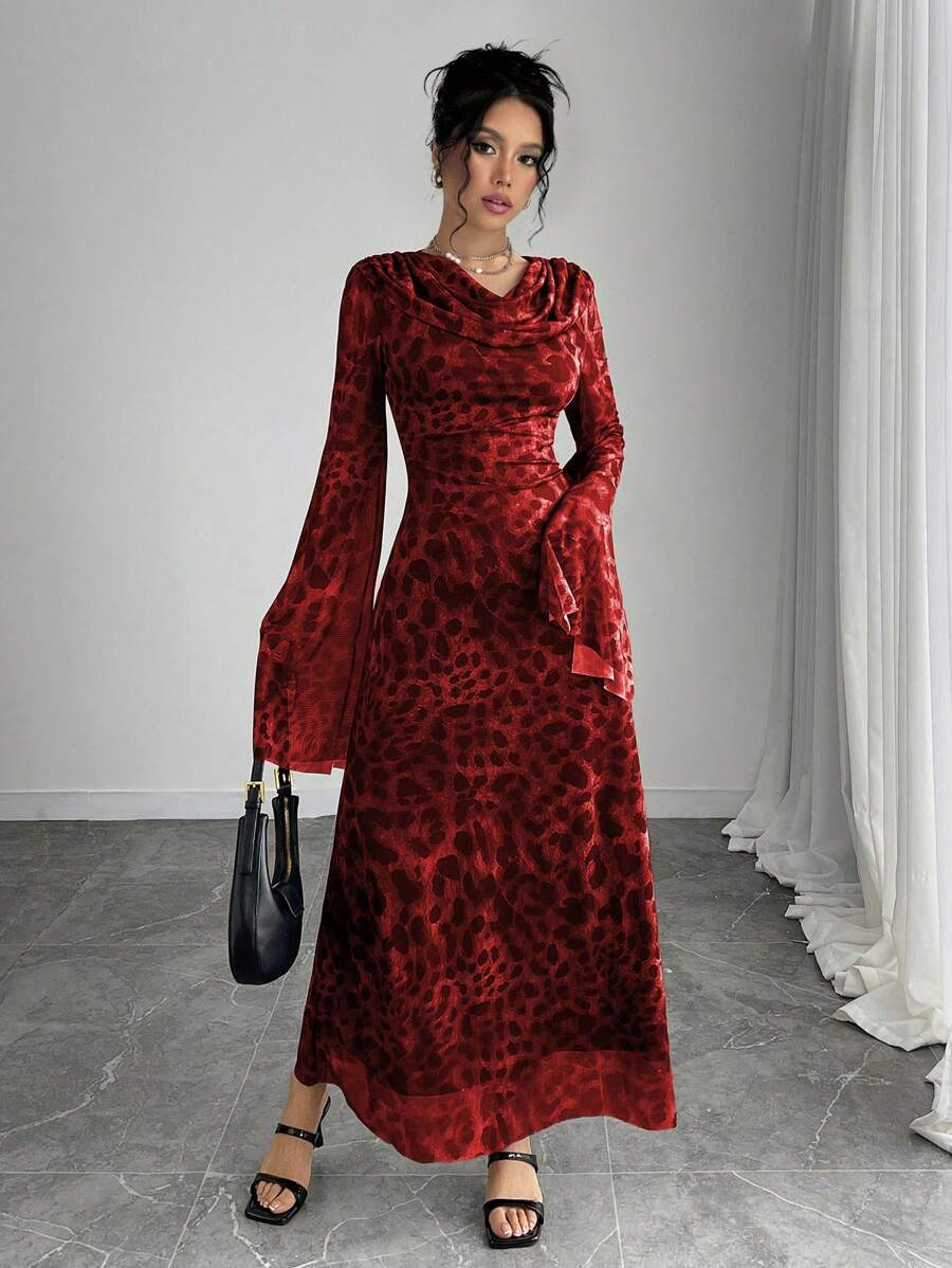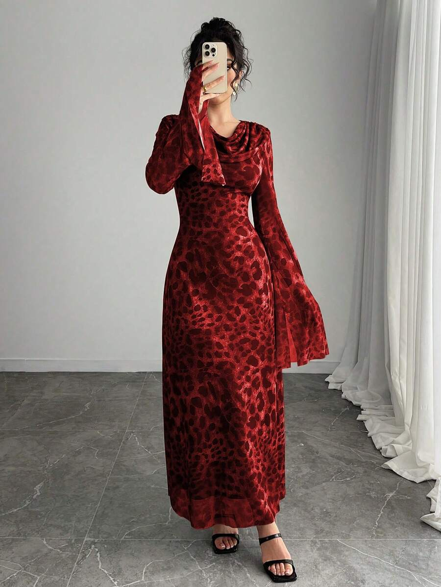 Rafferiza فستان نسائي ضيق الجسم ذو كشكشة في الأكمام ذو فتحة في الرقبة، بطبعة نمر